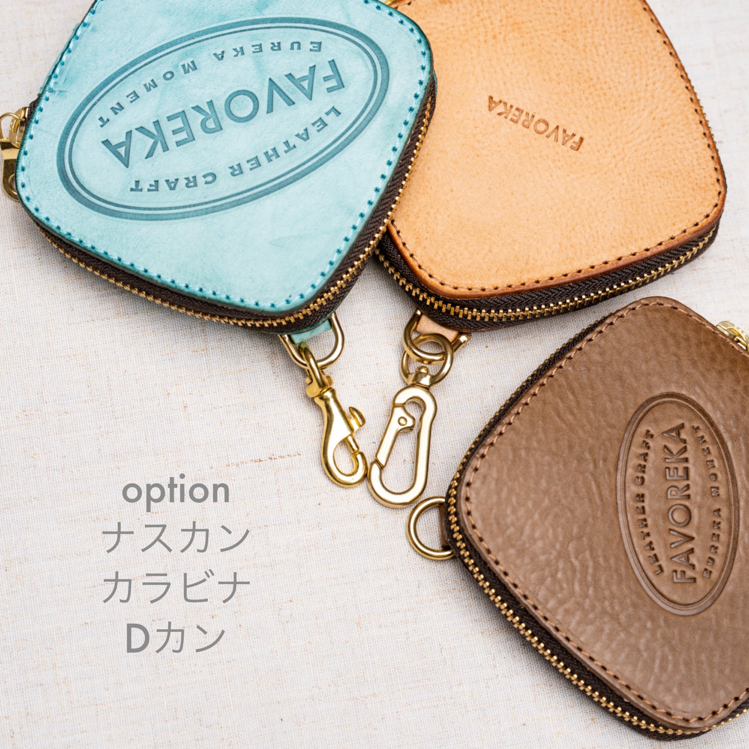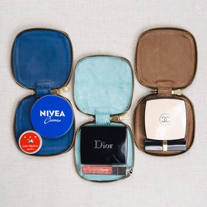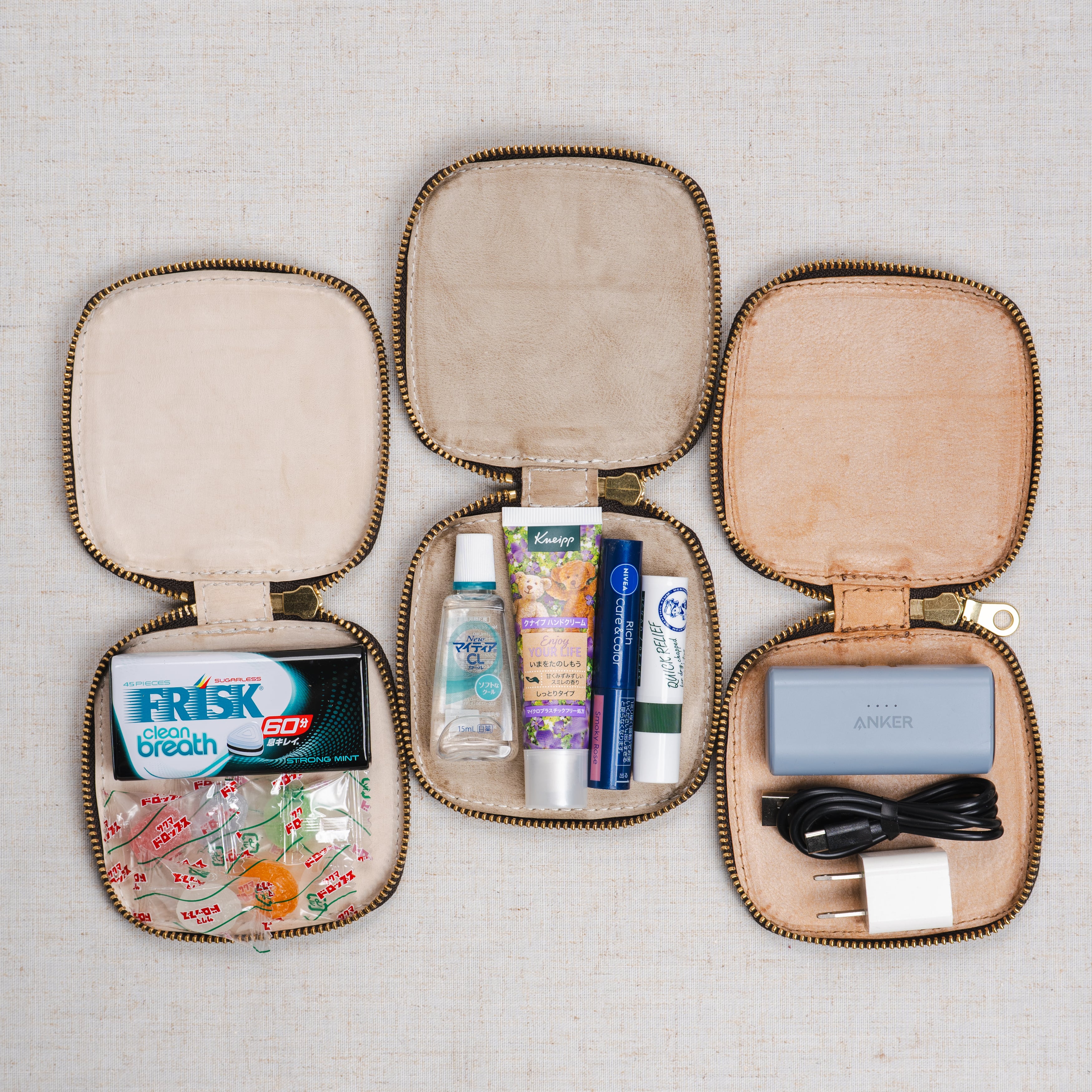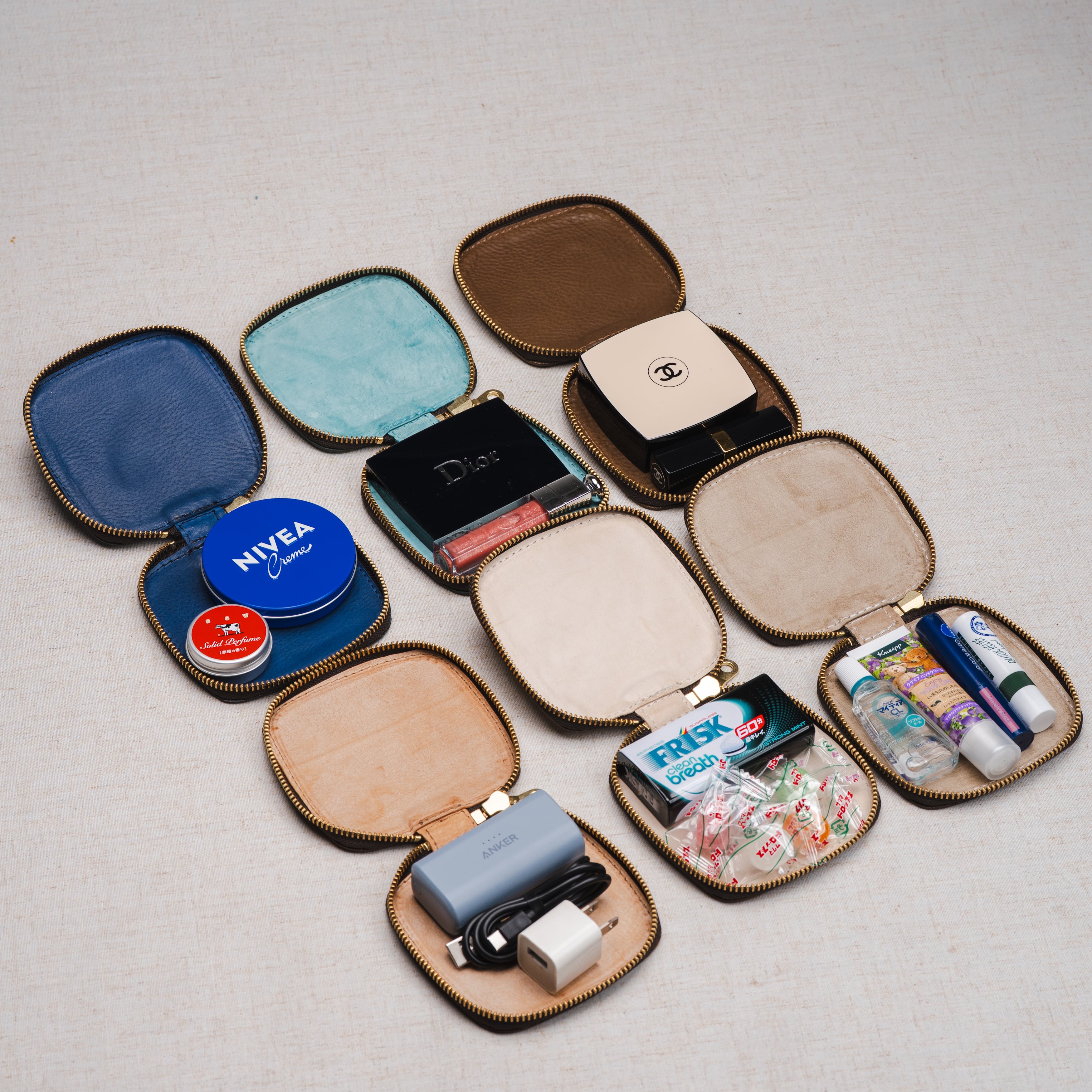 Diamant 10 ひしがた、少し大きめの宝石箱 フランス語で「ダイヤモンド」を意味するDiamant(ディアマンテ)。トランプのダイヤが由来です。 美しい四角形のフォルムが目を惹く、小さなポーチです。 楕円型の「Palma」から広がる可能性のひとつとして誕生しました。 製品仕様 革素材 アラスカ、ネブラスカ、カントリー(ブルー) サイズ 横10.5cm × 縦10.5cm × 厚み2cm 重さ 80g 10.5cmという「機能する」スクエア ただ可愛いだけでなく、本当に「使える」サイズ感を追求しました。 試行錯誤を重ねてたどり着いた10.5cm角は、バッグの中にすっきり忍ばせるのはもちろん、外に提げても様になる絶妙なバランス。角の隅々まで空間を無駄なく使える設計です。 まるで宝石箱のように、大切な必需品を静かに、そして美しく包み込みます。 Palma同様、ファスナーの開閉位置にもこだわりました。 オプション金具で吊り下げたとき、開閉の起点は時計の9時位置にあり、そこから時計回りに動きます。最終的には貝のようにフルオープンになりますが、9時から4時までなら中身がこぼれにくく、必要なものだけをサッと取り出せます。 内張りも総革を施した贅沢な仕様。 紫外線が当たりにくい内側と外側で生まれる、本革ならではのエイジング差もあわせてお楽しみください。 頼もしい容量で叶える「まとめる」収納力 四角いアイテムがデッドスペースなく角までピタッと収まる快感。10.5cm角のスクエア型は、お出かけの必須セットをまるごと受け止める頼もしさが魅力です。 ⭐︎お直しのコスメポーチとして、四角いファンデーションコンパクトの横に、リップやグロスが綺麗に並びます。 ⭐︎頼れるガジェットポーチとして、モバイルバッテリーや充電ケーブル、ACアダプターが、まるで専用ケースのようにジャストフィット。 ⭐︎毎日のケアやエチケット用品に、目薬、ハンドクリームのチューブ、あるいは複数本のリップ。大きめのタブレット菓子や飴玉を詰め込んでおくのにも最適です。 パズルを埋めるように、あなただけのアイテムが美しく収まる様子をお楽しみください。 自由なスタイルをつくるオプション ・Dカン ナスカン付きのアイテムやネックストラップと組み合わせることで、ライフスタイルに合わせた様々な拡張性が生まれます。 ・カラビナ または ナスカン 装いのアクセントとして、お好みの形を。カバンに直接取り付けたり、ズボンのベルトループに提げて小さなベルトポーチのように身軽にお使いいただけます。 選べる刻印 デフォルトの「中刻印」のほか、エンボス加工が美しい「楕円刻印」や「楕円刻印特大」からお選びいただけます。 シリーズ展開 Palmaを起点とした本シリーズは、全部で5つの形とサイズをご用意しています。 • 楕円型の Palma • 四角形の Diamant 8 および Diamant 10 • 丸い形の Luna および Petite Luna お客様のライフスタイルや用途に合わせて、ぜひあなたにぴったりのひとつをお選びください。 あなたの大切な日常を、美しいディアマンテのなかに。