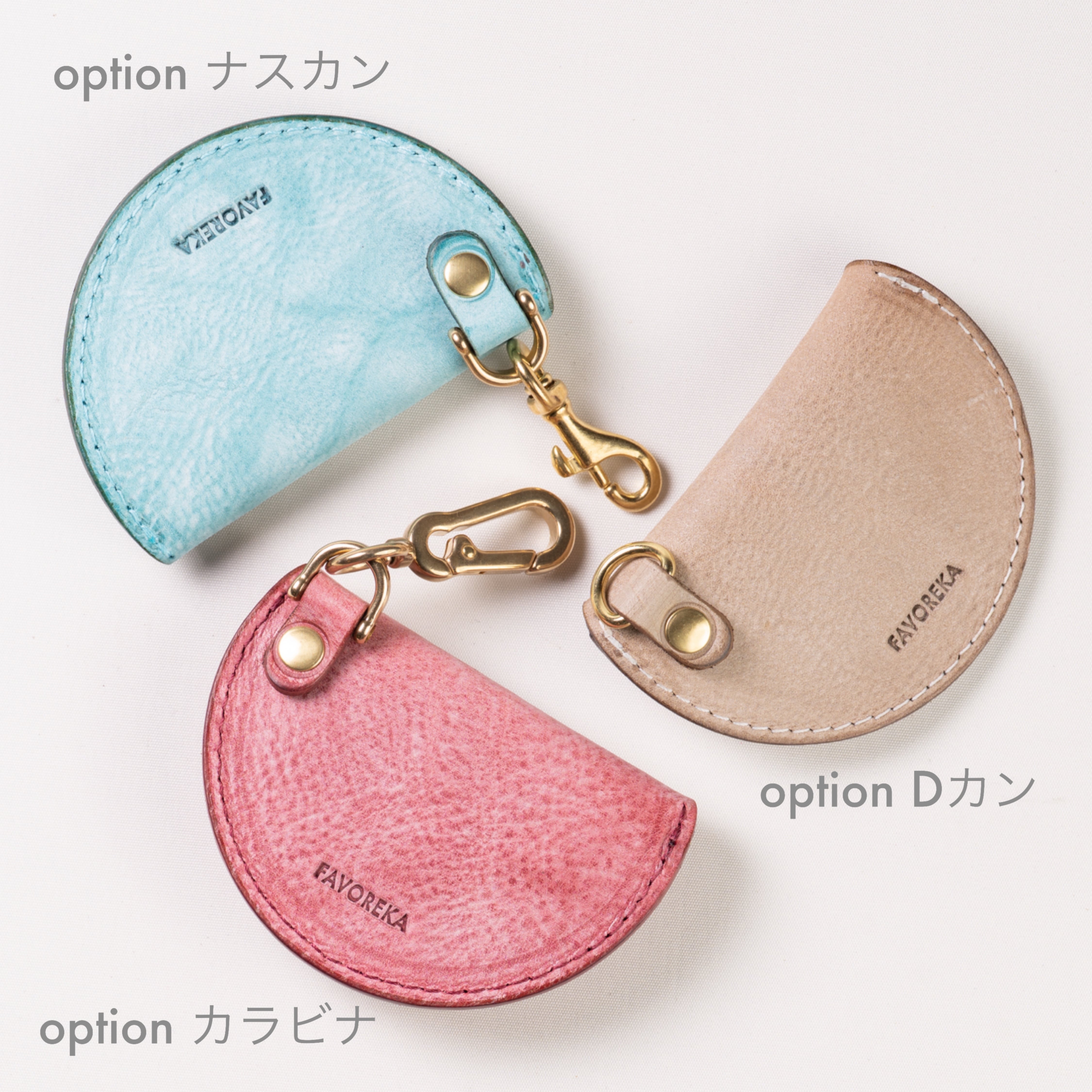 お月様マルチケース コインケース、ピルケース、小物入れ。 [革]ネブラスカ、カントリー(ブルー)、アラスカ [サイズ] W10cm × H6.5cm フラップを閉めた姿が三日月のようで開けると満月。 開閉部にはイタリーホックを使用しています。 マチがないフラットなケースでコンパクトながら100円なら20枚入ります。 マチがないので物がを入れなかったた膨らみませんし物を入れると革が形に沿って包みます。 最近はコインを使う機会も減っているからこそここぞという時に無くて困る事も多いかと思います。 また、コンパクトでフラットなのでお薬などの持ち運びにも適しています。 鍵、単体でも数本入ります。 スマートに安心できるそんなケースです。 オプションについて 拡張性の高いD管、ナスカン、カラビナをオプションにて取り付け可能です。 アイデア次第で様々な拡張性がございます。